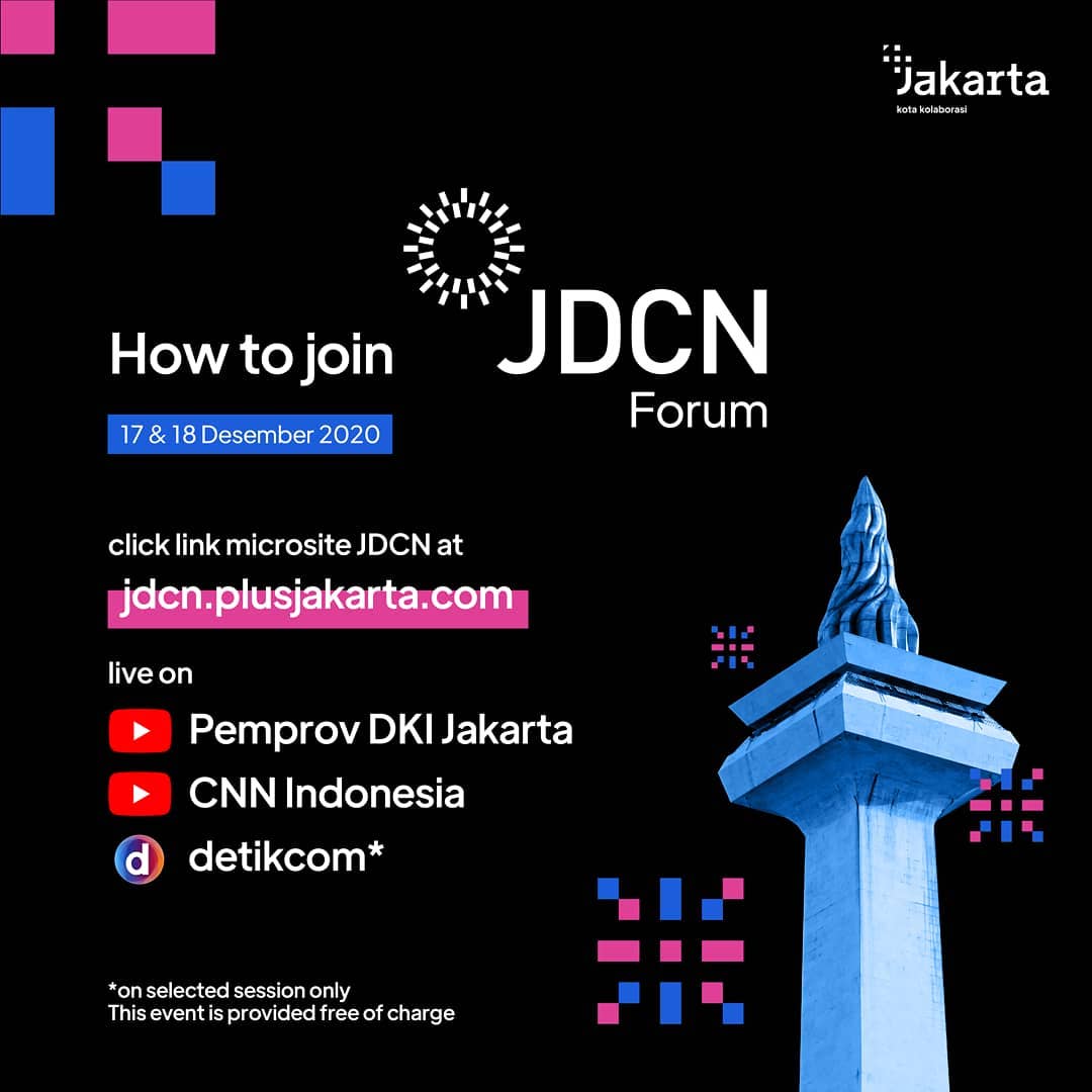 Mari rayakan pesta kolaborasi Jakarta! Pada penghujung tahun 2020, Jakarta akan menampilkan kolaborasi-kolaborasi yang telah dilakukan sepanjang tahun dan mendiskusikan ide-ide kolaborasi ke depan dalam Forum Jejaring Kolaborasi Kota (JDCN Forum 2020) pada tanggal 17 dan 18 Desember 2020